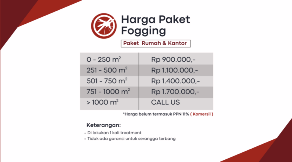 Berdasarkan hasil inspeksi, teknisi kami akan menentukan metode pembasmian yang paling efektif. Kami menggunakan kombinasi dari cold fogging untuk area dalam dan hot fogging untuk area luar untuk memastikan nyamuk di rumah Anda terbasmi. Bahan kimia yang kami gunakan telah disetujui oleh otoritas kesehatan dan aman untuk digunakan di lingkungan rumah tangga.